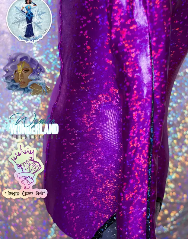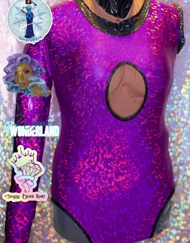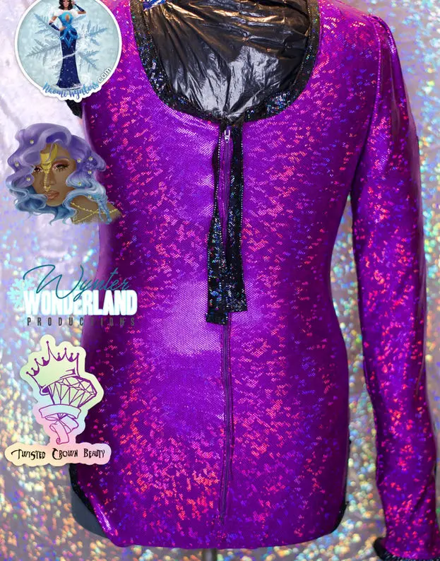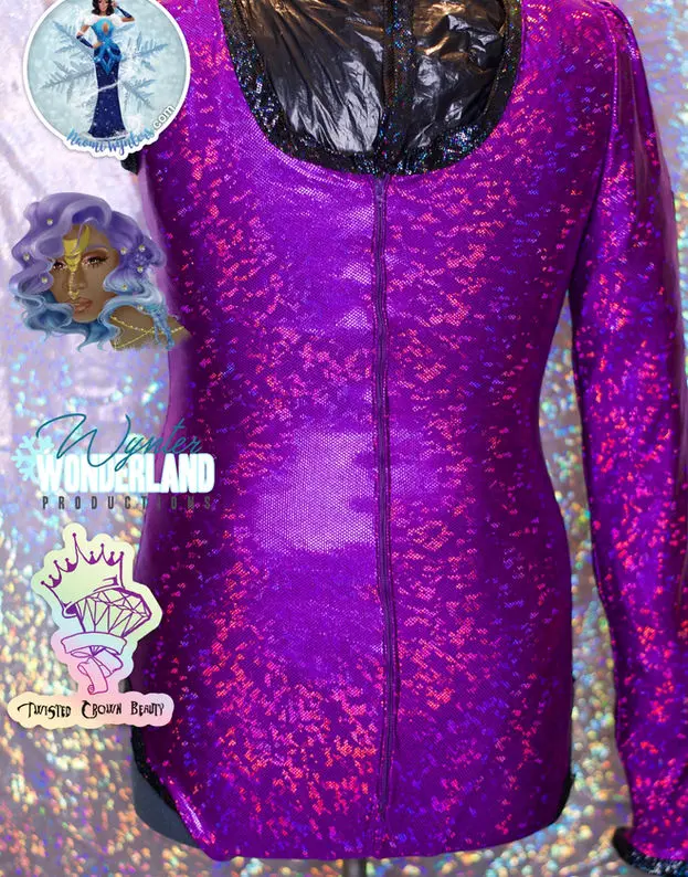 Purple leotard with keyhole, metal zipper, black pinstripe down sleeve, straps hang in back to tie or hang free