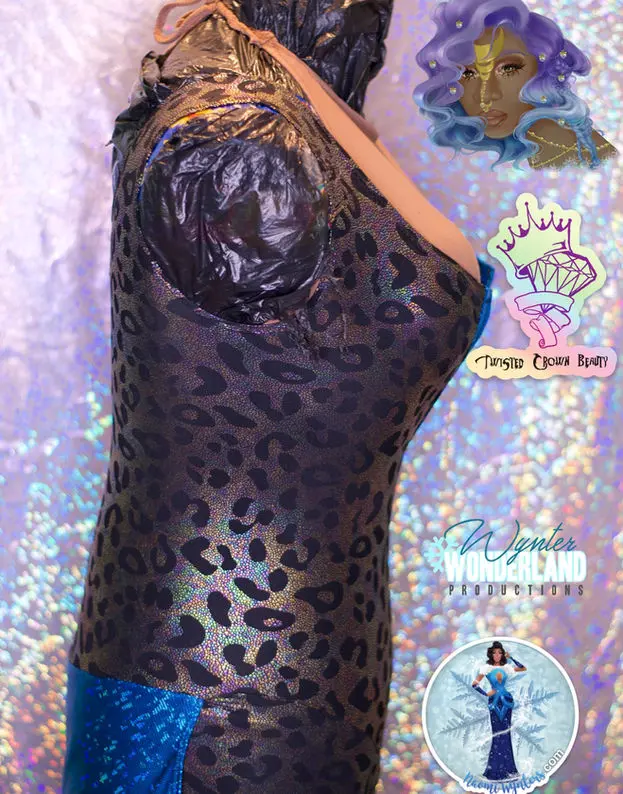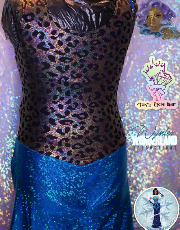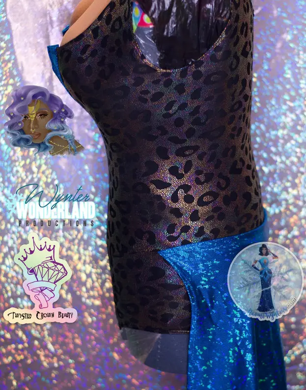 Leopard leotard with blue skirt and v- cutout trimmed in blue. No zipper.
