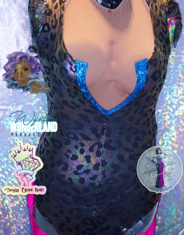 V-Cut Leopard Leotard with blue trim and back skirt